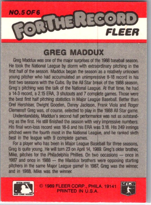 This is a really nice example of a 1989 Fleer #5 Greg Maddux For the Record.
