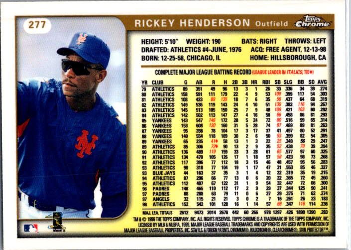 This is a really nice example of a 1999 Topps Chrome #277 Rickey Henderson .