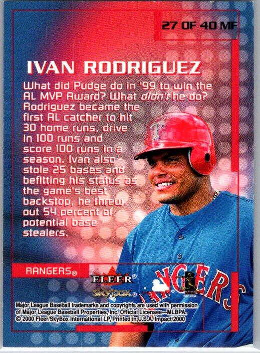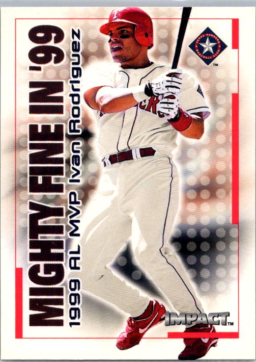 This is a really nice example of a 2000 Fleer Impact #27MF Ivan Rodriguez Mighty Fine in '99.