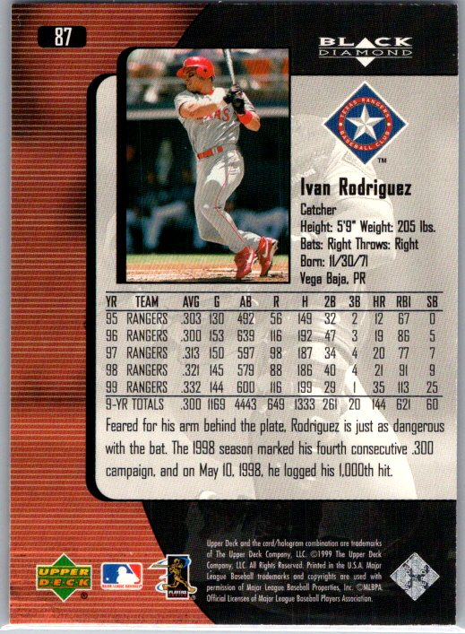 This is a really nice example of a 2000 Upper Deck Black Diamond #87 Ivan Rodriguez .