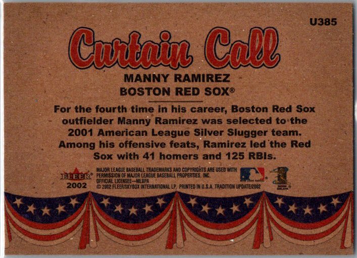 This is a really nice example of a 2002 Fleer Tradition Update #U385 Manny Ramirez .