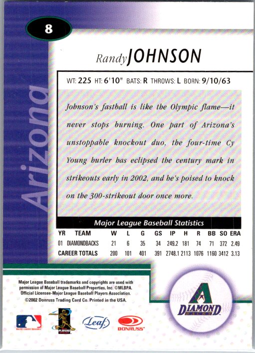 This is a really nice example of a 2002 Leaf Certified #8 Randy Johnson .