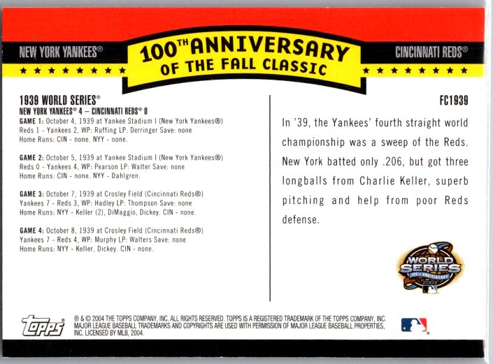 This is a really nice example of a 2004 Topps #FC1939 1939 World Series Fall Classic Covers.