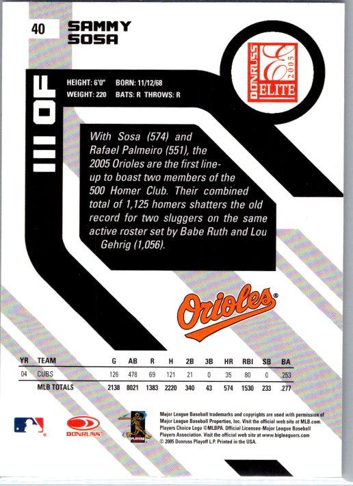 This is a really nice example of a 2005 Donruss Elite #40 Sammy Sosa .