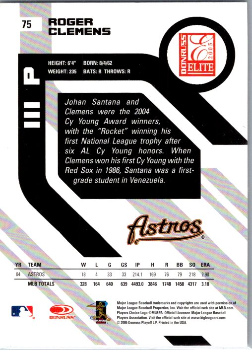 This is a really nice example of a 2005 Donruss Elite #75 Roger Clemens .