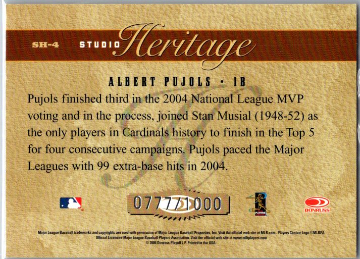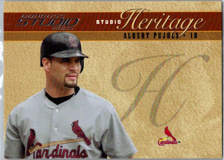 This is a really nice example of a 2005 Donruss Studio #SH-4 Albert Pujols Studio Heritage.