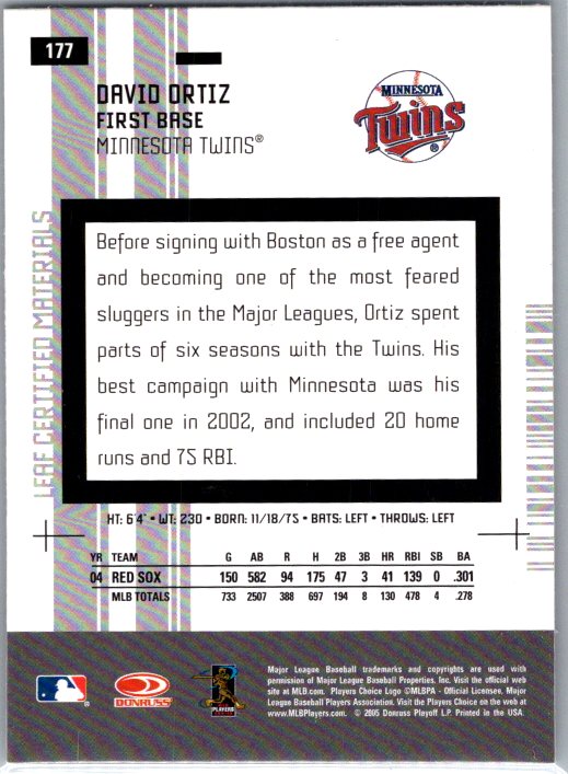 This is a really nice example of a 2005 Leaf Certified Materials #177 David Ortiz .
