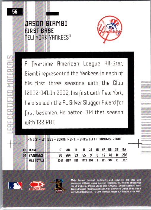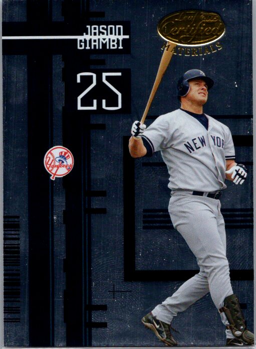 This is a really nice example of a 2005 Leaf Certified Materials #56 Jason Giambi .