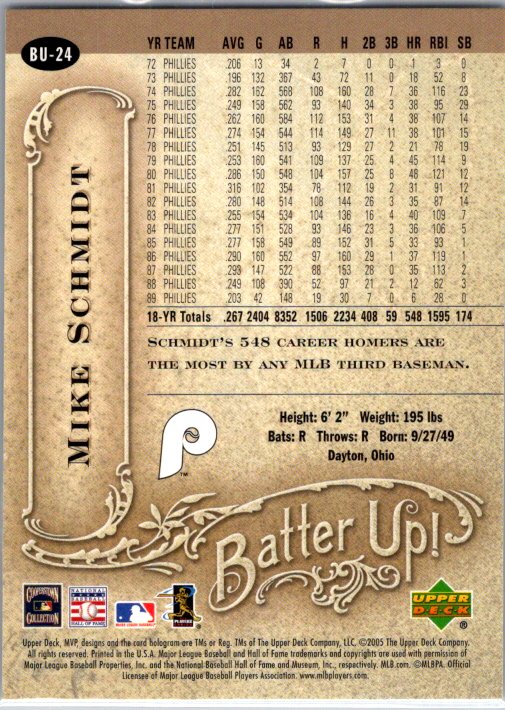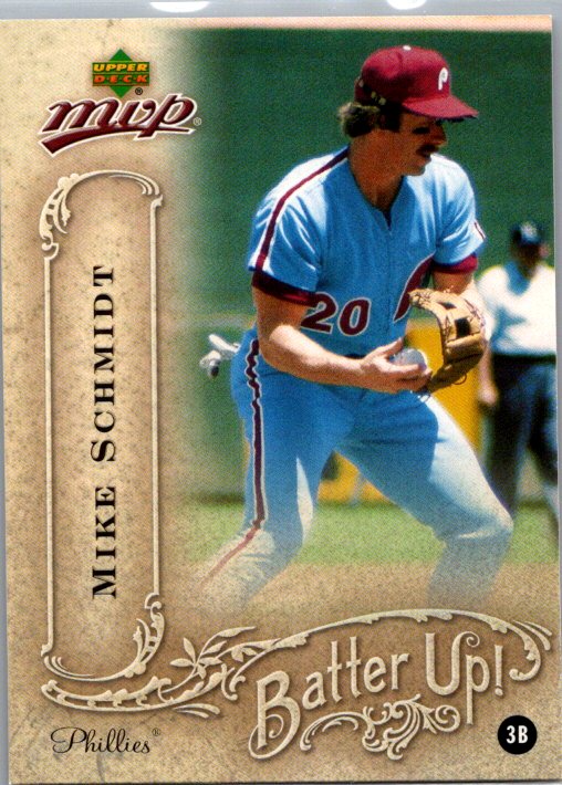 This is a really nice example of a 2005 Upper Deck MVP #BU-24 Mike Schmidt Batter Up!.