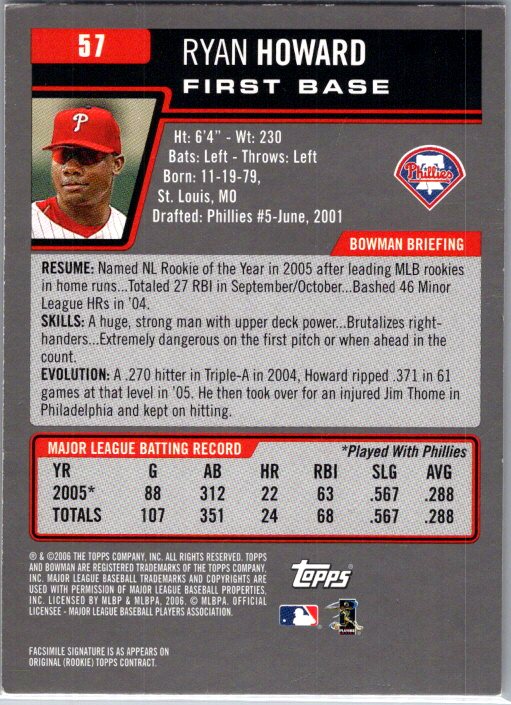 This is a really nice example of a 2006 Bowman #57 Ryan Howard .