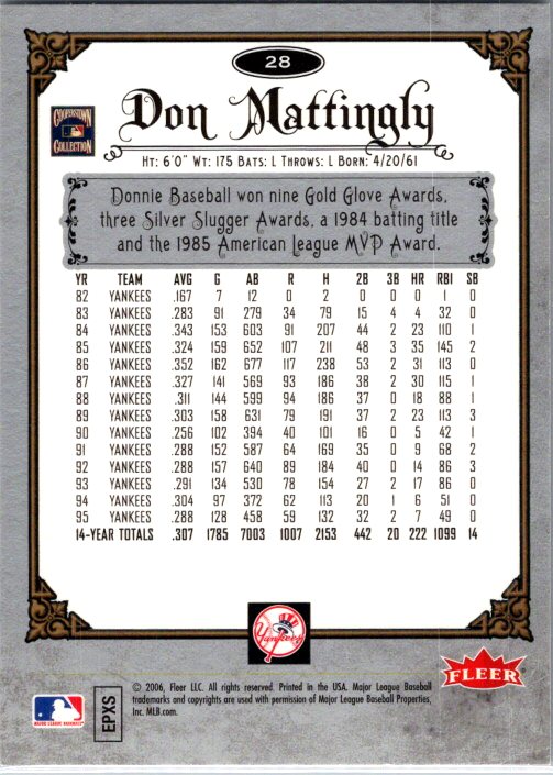 This is a really nice example of a 2006 Fleer Greats of the Game #28 Don Mattingly .