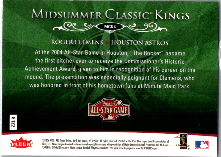 This is a really nice example of a 2006 Ultra #MCK4 Roger Clemens Midsummer Classic Kings.
