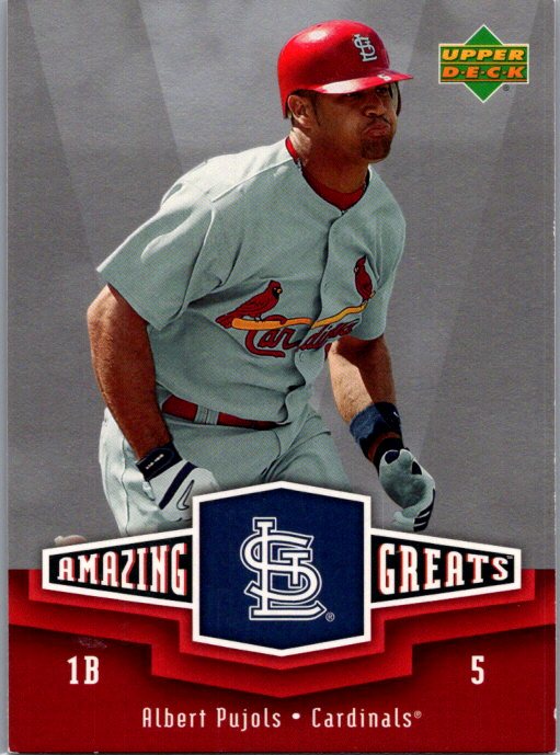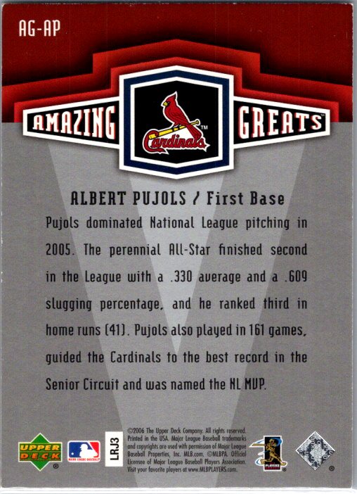 This is a really nice example of a 2006 Upper Deck #AG-AP Albert Pujols Amazing Greats.