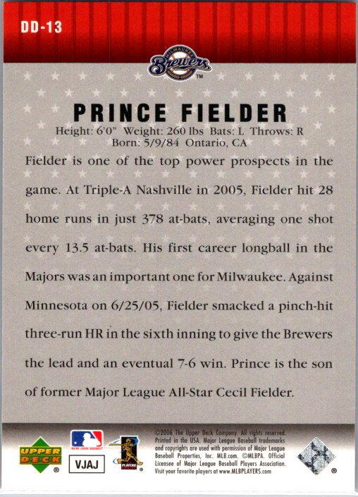 This is a really nice example of a 2006 Upper Deck #DD-13 Prince Fielder Diamond Debut.