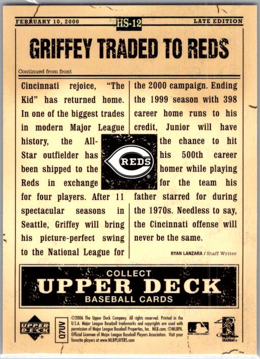 This is a really nice example of a 2006 Upper Deck First Pitch #HS-12 Ken Griffey Jr. Hot Stove Headlines.