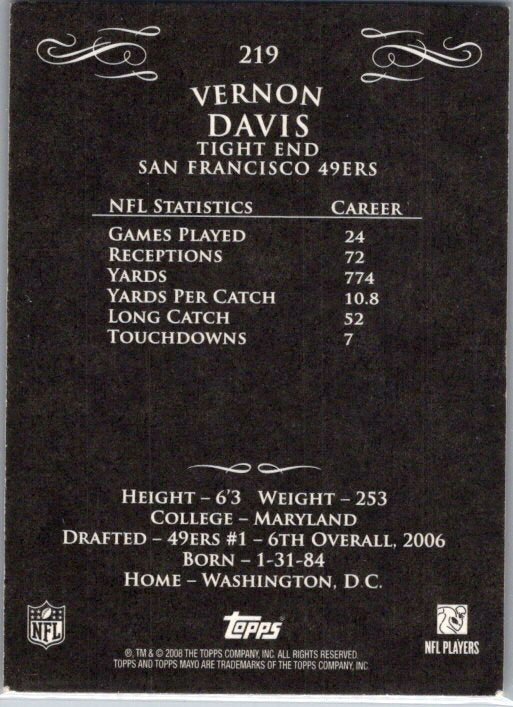 This is a really nice example of a 2008 Topps Mayo #219 Vernon Davis .