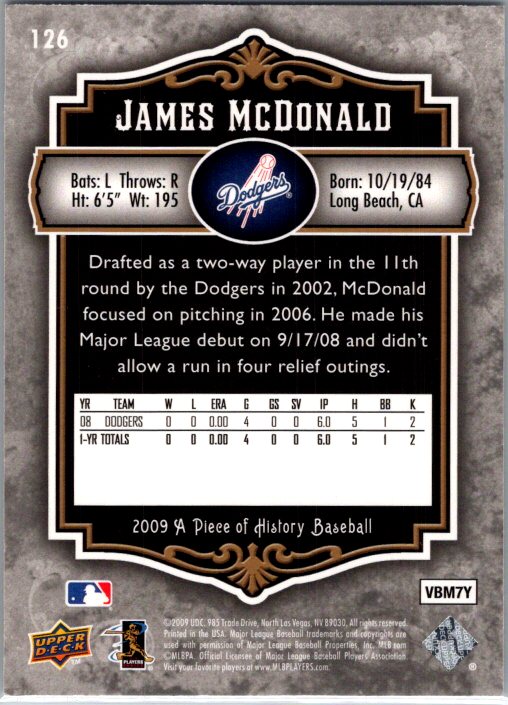 This is a really nice example of a 2009 Upper Deck A Piece of History #126 James McDonald .