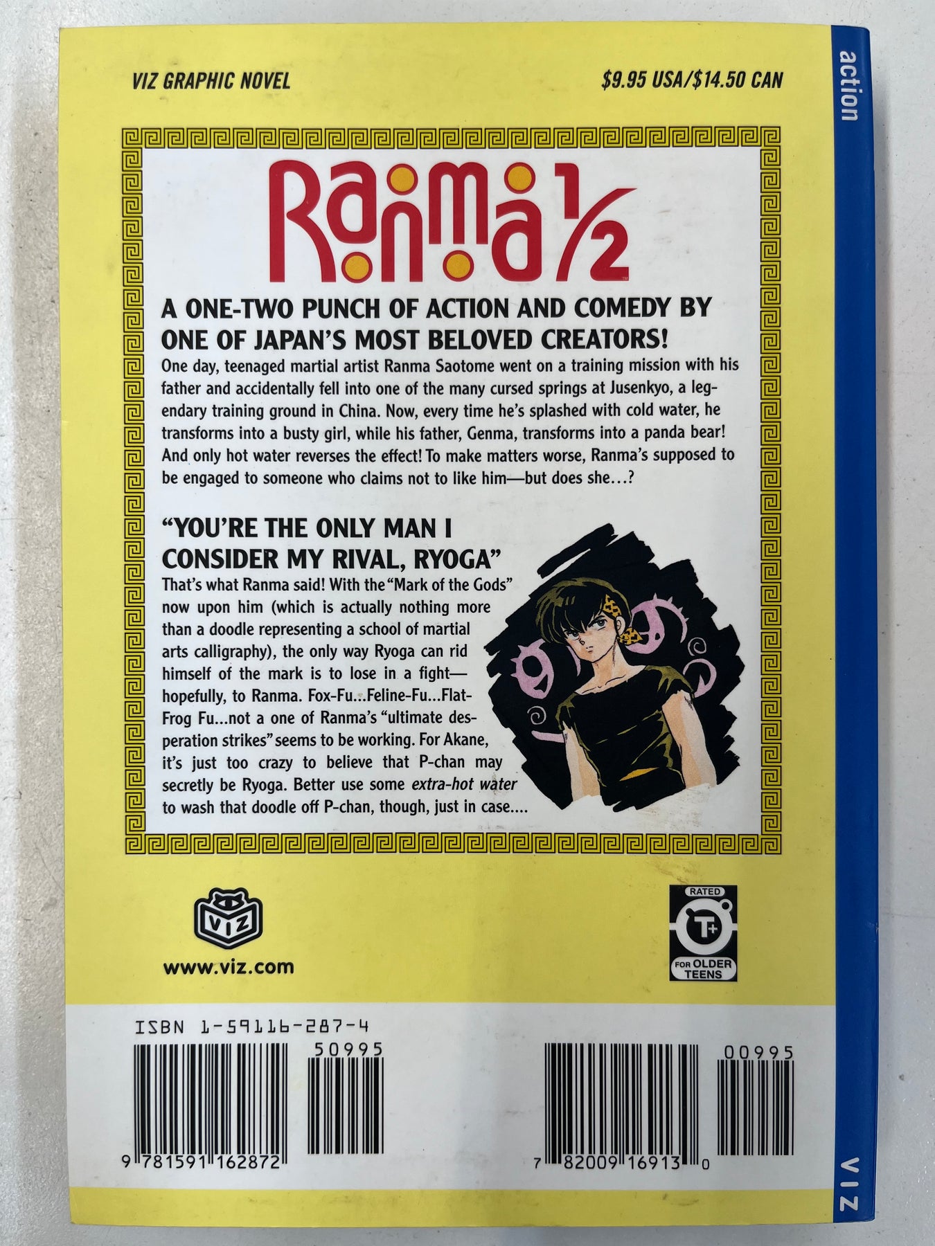 The "Mark of the Gods" (actually a doodle representing a school of martial-arts calligraphy) is now upon Ryoga, and the only way he can lose the doodle is to lose a fight -- hopefully to Ranma! Fox Fu, Feline Fu, Flat-Frog Fu - not one of Ranma's "ultimate desperation strikes" seems to be working! For Akane, it's just too crazy to believe that P-chan may secretly be Ryoga! Better use some extra-hot water to wash that doodle off P-chan, though, just in case.