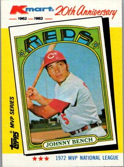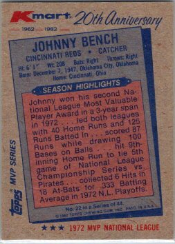 This is a really nice example of a 1982 K-Mart #22 Johnny Bench.