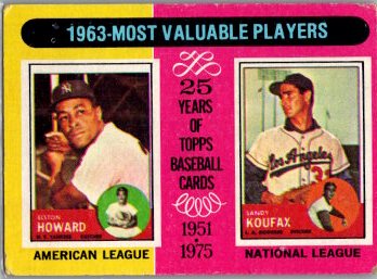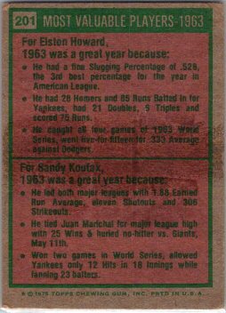 This is a really nice example of a 1975 Topps #201 1963 MVPs (Elston Howard / Sandy Koufax) MVP .