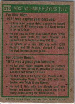This is a really nice example of a 1975 Topps #210 1972 MVPs (Rich Allen / Johnny Bench) .