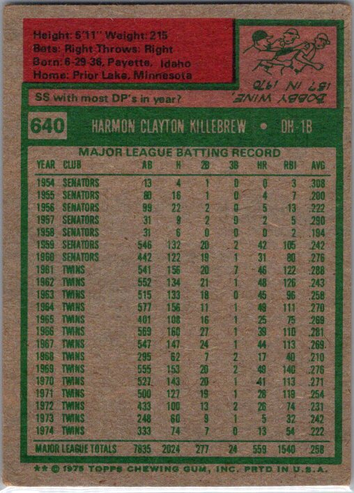 This is a really nice example of a 1975 Topps #640 Harmon Killebrew .