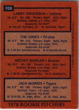 In 1978 1978 Rookie Pitchers (Larry Andersen / Tim Jones / Mickey Mahler / Jack Morris) RC, DP played for the Indians / Pirates / Braves / Tigers.
