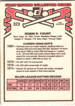 This is a really nice example of a 1981 Donruss #323 Robin Yount .