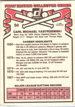 This is a really nice example of a 1981 Donruss #94 Carl Yastrzemski .