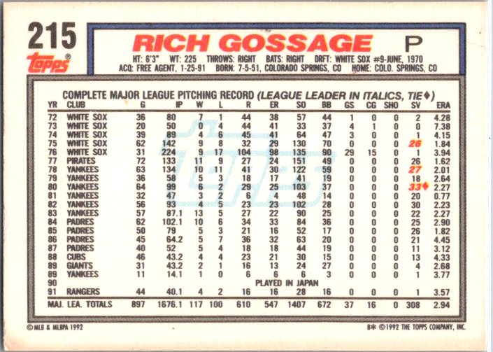 This is a really nice example of a 1992 Topps #215 Rich Gossage .