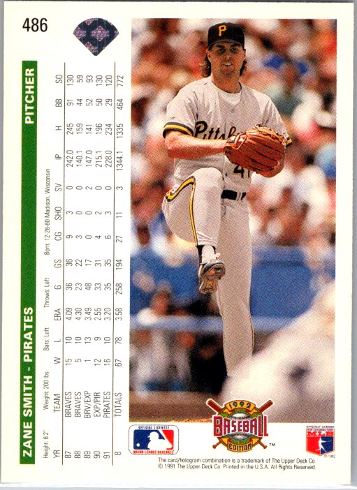 This is a really nice example of a 1992 Upper Deck #486 Zane Smith .
