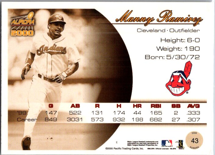 This is a really nice example of a 2000 Pacific Aurora #43 Manny Ramirez .