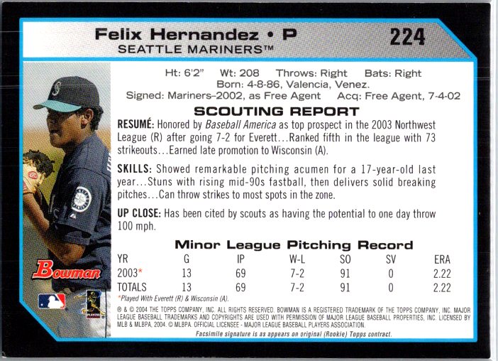 This is a really nice example of a 2004 Bowman #224 Felix Hernandez .