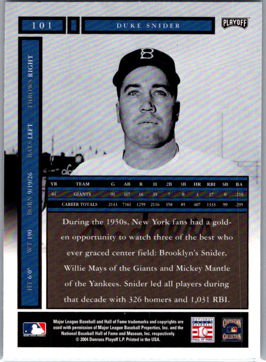 This is a really nice example of a 2004 Playoff Honors #101 Duke Snider .