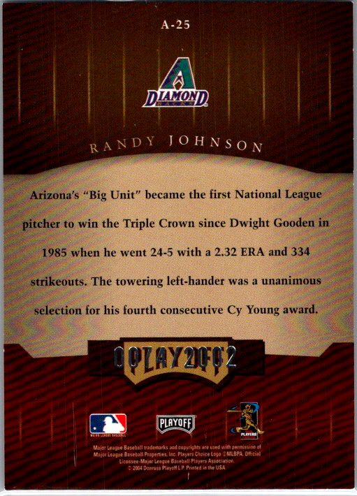 This is a really nice example of a 2004 Playoff Honors #A-25 Randy Johnson Awards.
