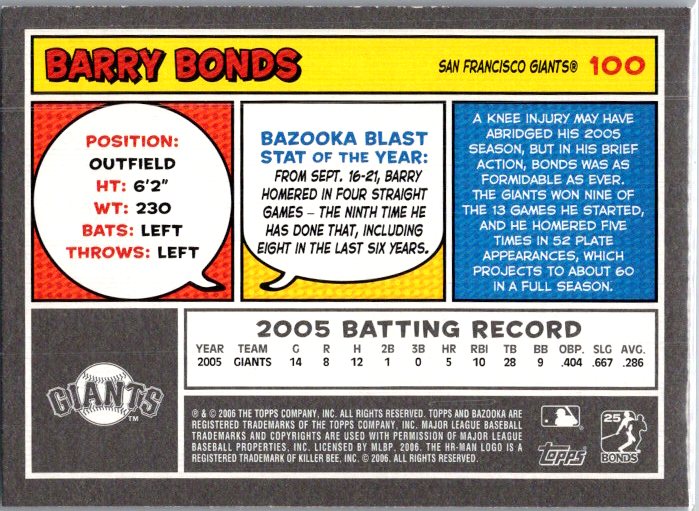 This is a really nice example of a 2006 Bazooka #100 Barry Bonds .