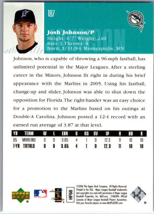 This is a really nice example of a 2006 Upper Deck #187 Josh Johnson .