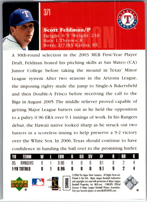 This is a really nice example of a 2006 Upper Deck #371 Scott Feldman .