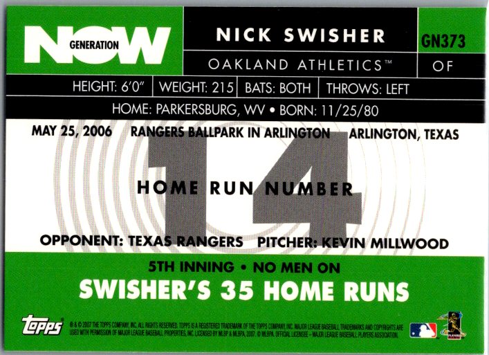 This is a really nice example of a 2007 Topps #GN373 Nick Swisher Generation Now.