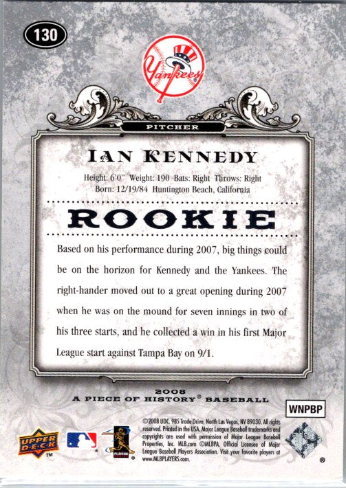 This is a really nice example of a 2008 Upper Deck A Piece of History #130 Ian Kennedy .