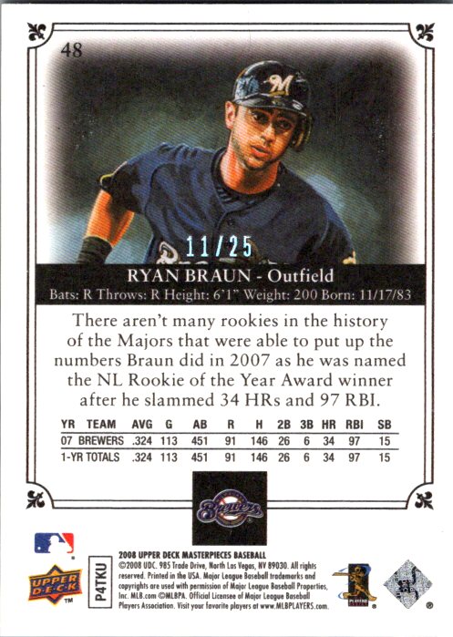 This is a really nice example of a 2008 Upper Deck Masterpieces #48 Ryan Braun .
