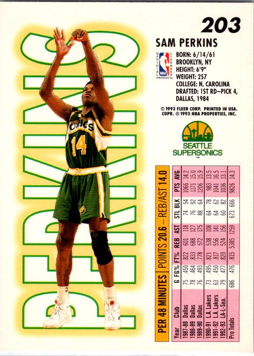 This is a really nice example of a 1993-94 Fleer #203 Sam Perkins .