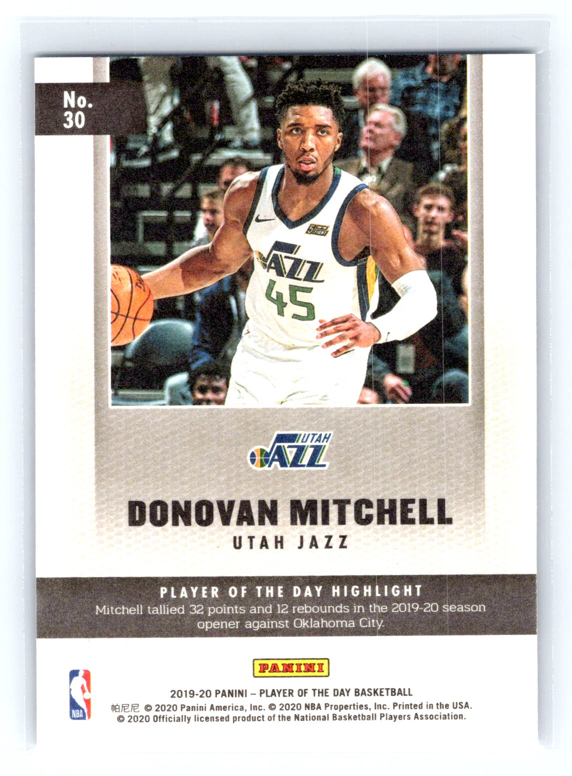 This is a really nice example of a 2019-20 Panini Player of the Day #30 Donovan Mitchell Silver.