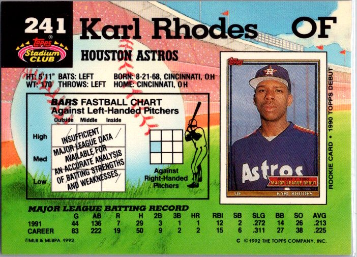 This is a really nice example of a 1992 Stadium Club #241 Karl Rhodes .