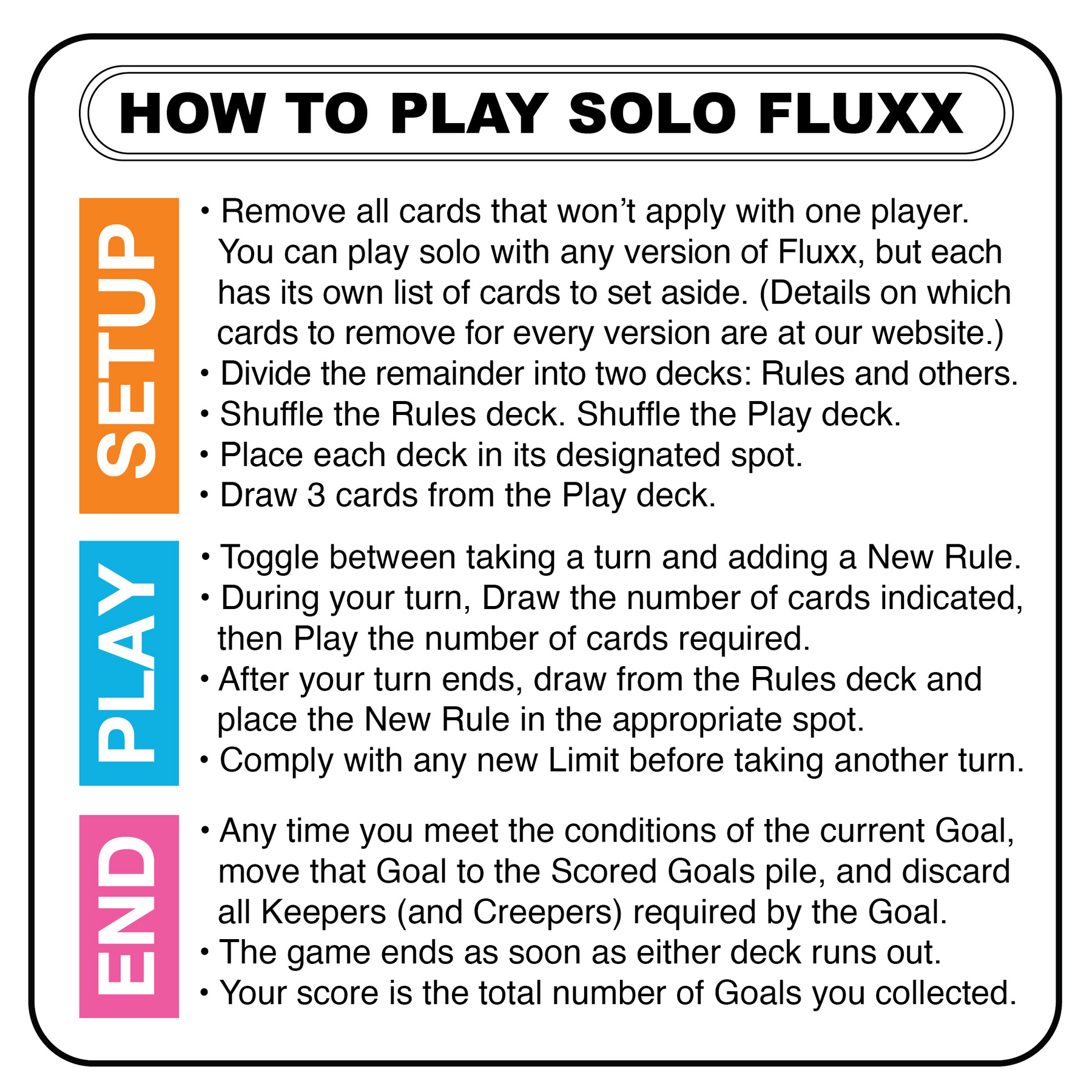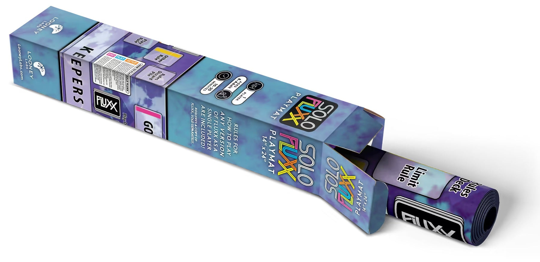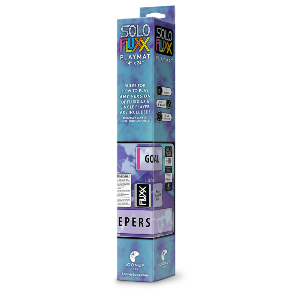 The Solo Fluxx Playmat is the perfect companion for your Fluxx card games! This gorgeous tie-dye neoprene playmat includes the official solo rules for Fluxx, plus an easy-to-use guide for removing the right cards for each version of the game.