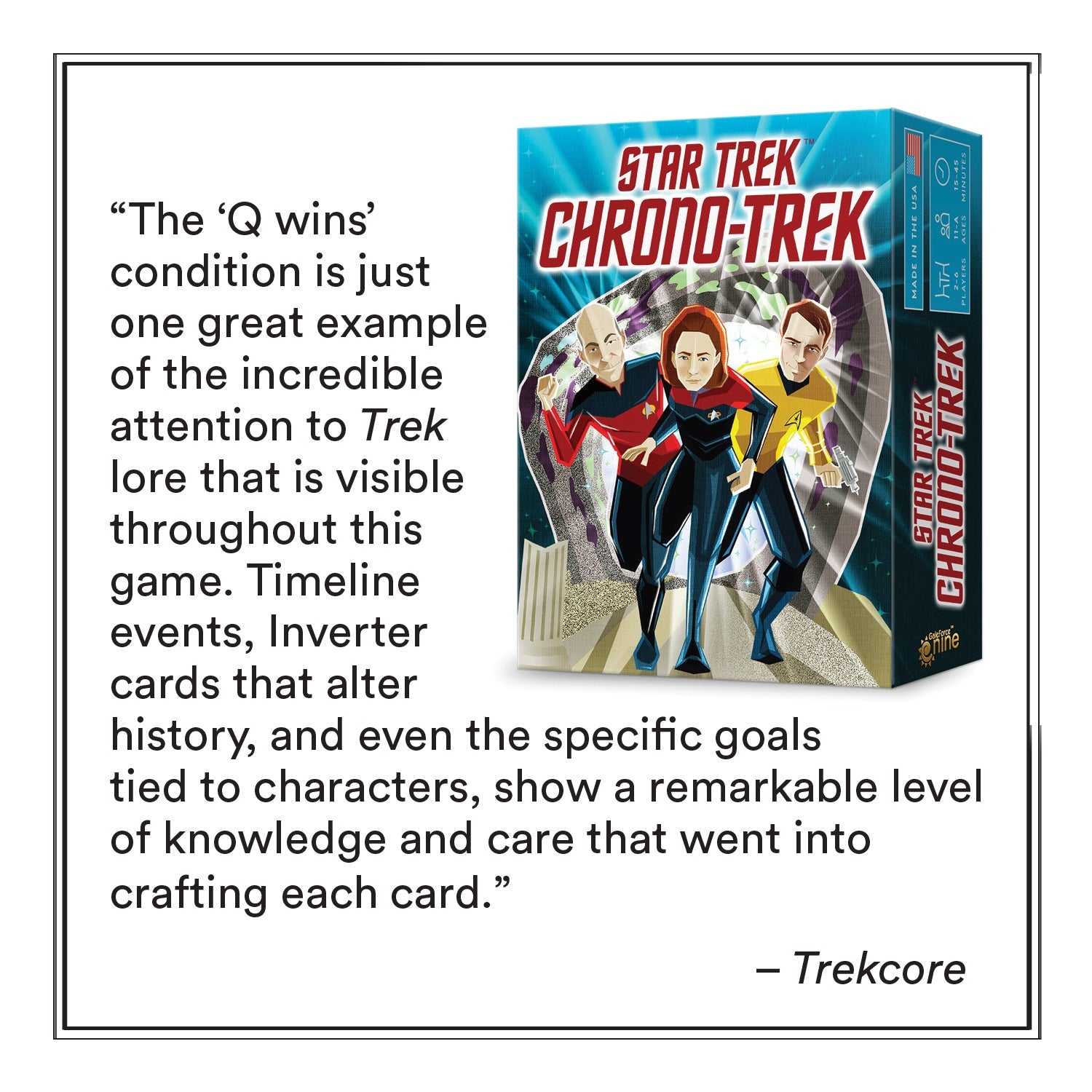 Trek across time and space as one of 32 possible characters from the vast Star Trek universe. Try to prevent the spread of the Devron temporal anomaly that starts in 2395 and progresses backwards through time, or everyone will lose (except Q)! You may need to set the timeline right to win, or you may need to collect up some prized Artifacts – or a little of both!