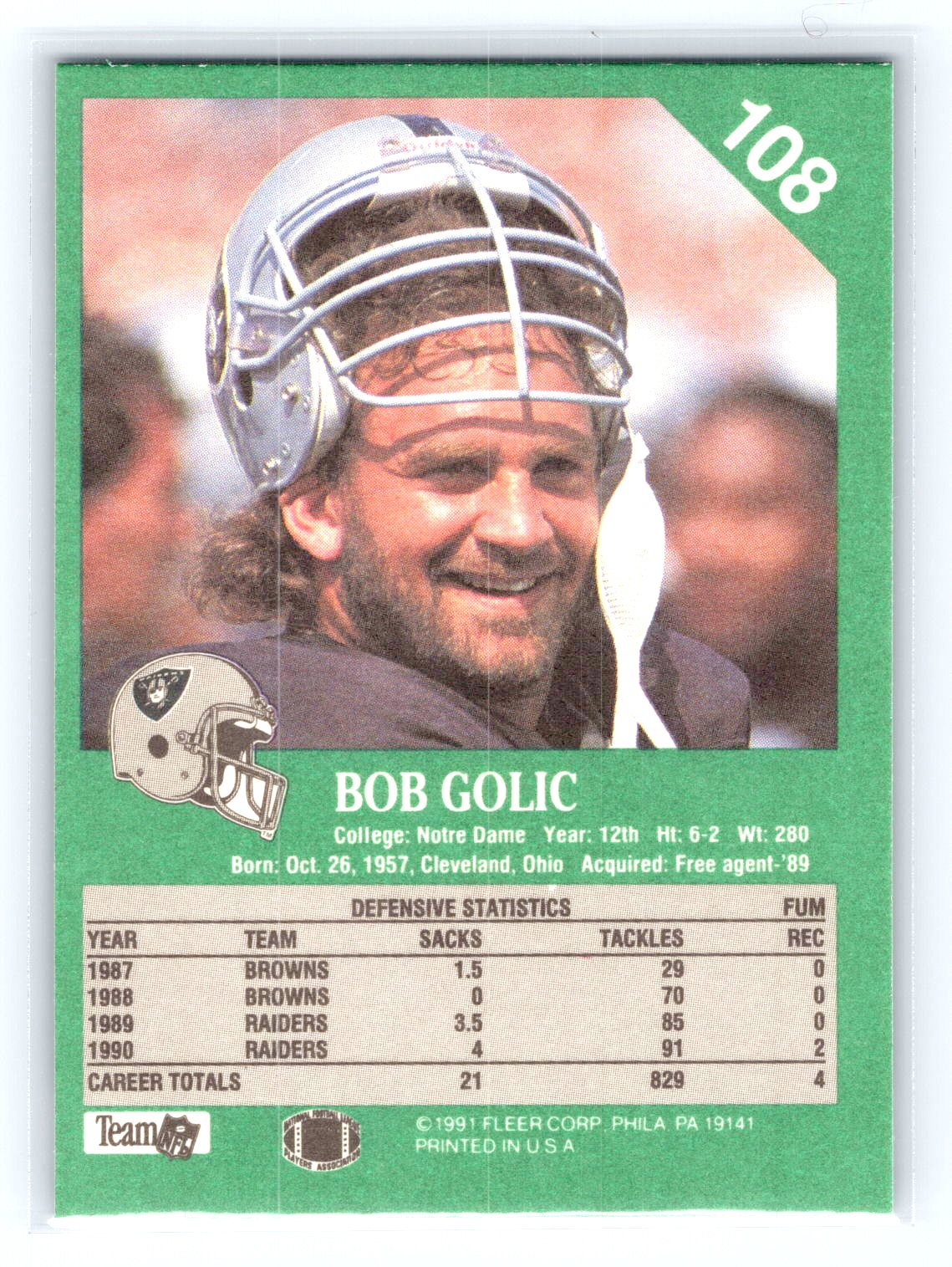 This is a really nice example of a 1991 Fleer #108 Bob Golic .