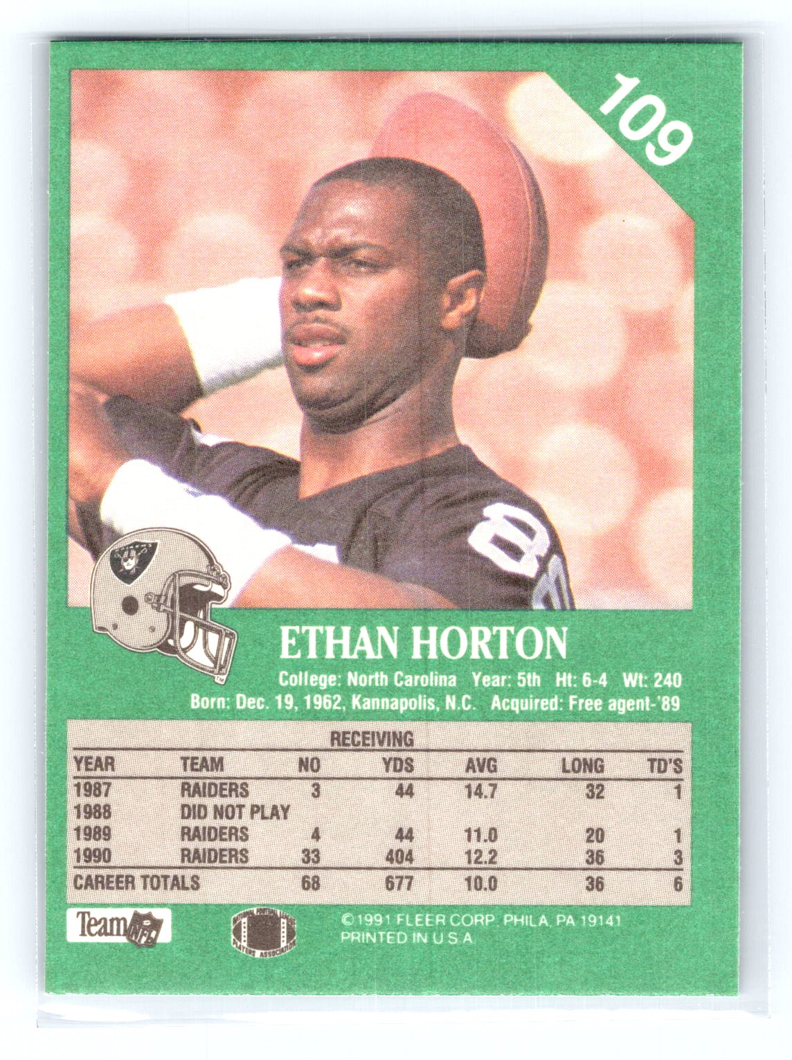 In 1991 Ethan Horton played for the Los Angeles Raiders.