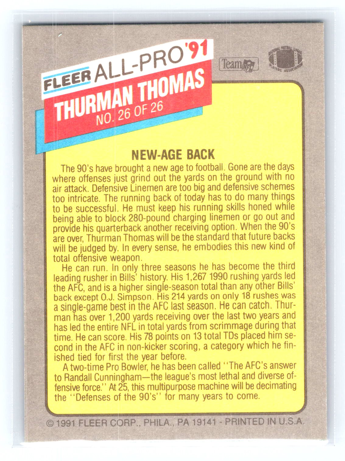 This is a really nice example of a 1991 Fleer #26 Thurman Thomas All-Pro '91.