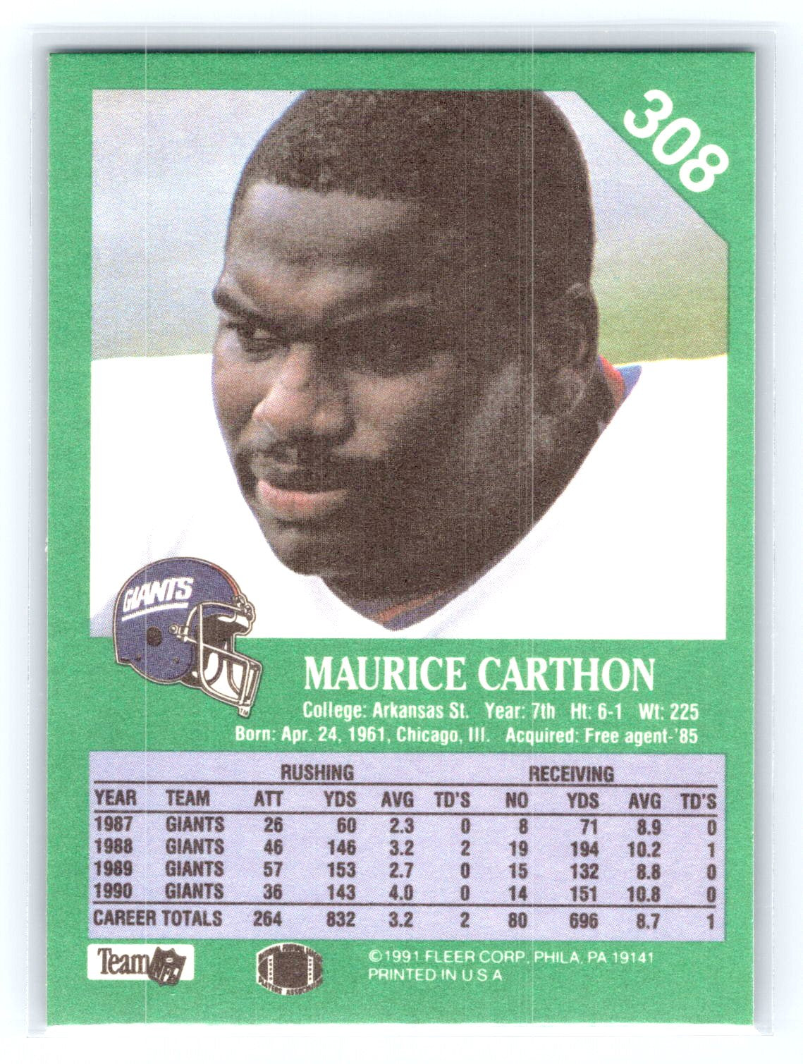 This is a really nice example of a 1991 Fleer #308 Maurice Carthon .